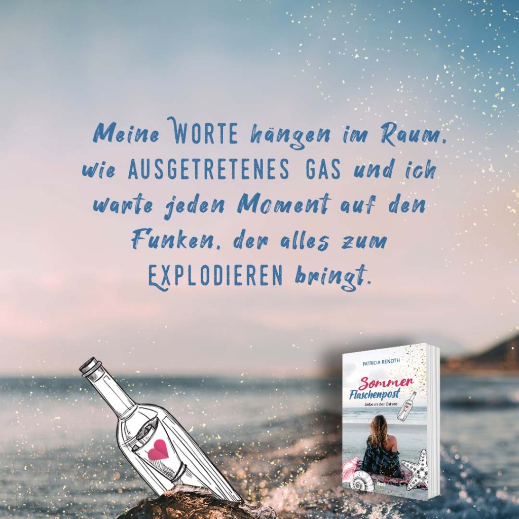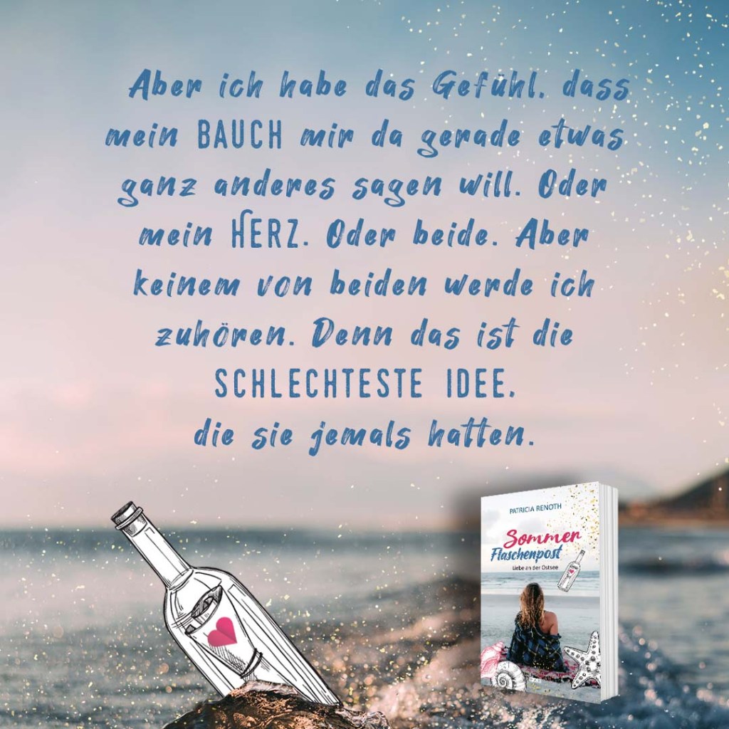 „Dieses Buch bietet Themen wie Liebe, Familie, Abenteuer, Träume, das Überwinden von Ängsten und vieles mehr. Die Charaktere und Dialoge sind so lebendig geschrieben, dass man sich leicht hineinfühlen kann. Man fiebert mit, wenn die Flaschenpost kommt und fragt sich, wer dahinter steckt. Das Ostsee-Setting verleiht dem Roman zudem eine Art Urlaubsgefühl. (…) Ich empfehle dieses Buch und weitere Werke von Patricia Renoth wärmstens allen, die romantische Lektüren mit Happy End lieben.“