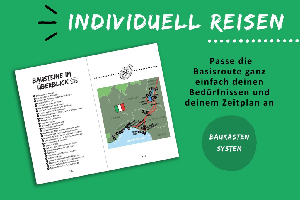 - Mit einem Baukastensystem passt du die Reiseroute ganz einfach an deine eigenen Bedürfnisse an. Die Basisroute lässt sich mit 30 Erlebnissen erweitern